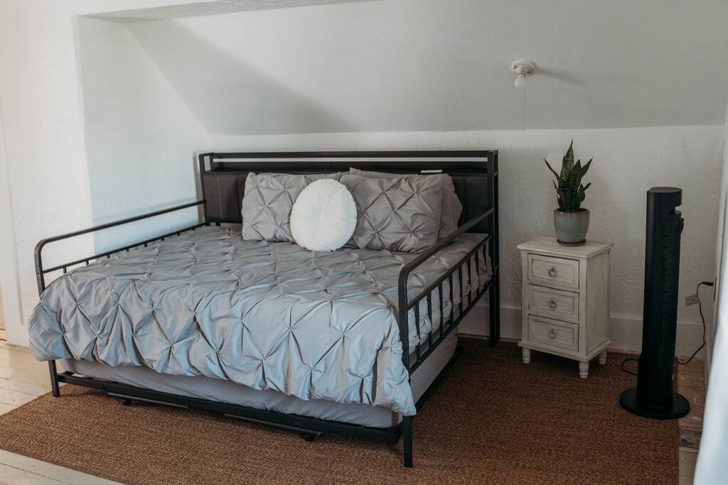 On the main floor, you’ll find a cozy living room with a sofa and TV, a dining area with seating for meals together, and a fully equipped kitchen with a pantry for longer stays. The king suite on this level provides a comfortable king bed, closet space, and easy access to the bathroom. A bright sunroom with a daybed and trundle offers extra sleeping space or the perfect spot to relax. Upstairs, the loft features a full-size daybed with a twin trundle, plus a second bedroom with a queen-size bed and closet. The home includes two full bathrooms (one upstairs and one downstairs), making it easy for groups to share the space. Guests also have access to the seasonal, non-heated pool (open April–September) and all outdoor and indoor spaces, so you can feel right at home during your stay